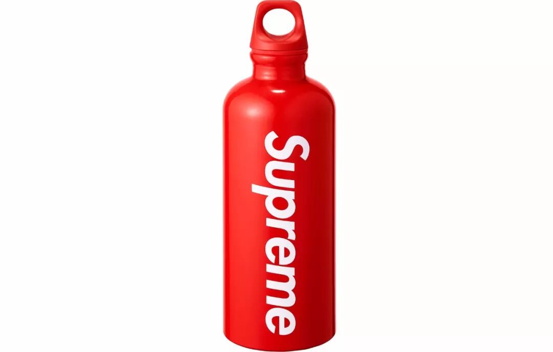 聯名飯盒的鋁製盒身搭配了 PP 塑料卡扣,並壓上了 Supreme 必不可少的 LOGO。除此之外,本次和 SIGG 的聯名產品還包括一隻水壺。