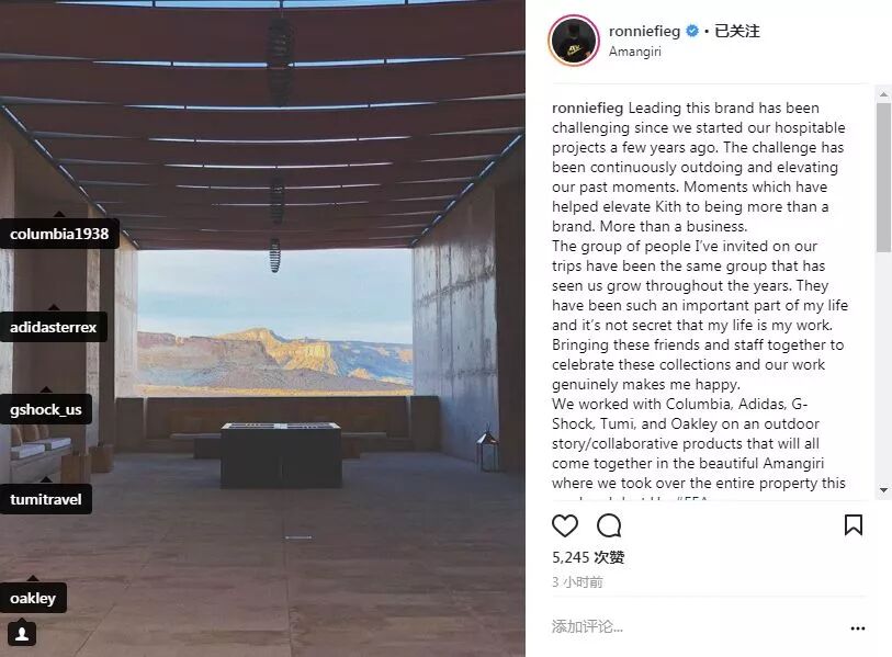 預估今次合作產品的發布時間,這應該也是 KITH 與 Columbia 首次在春夏季度推出合作系列,隨後 Ronnie Fieg 也發了一篇小作文感慨品牌成立至今遇到的各種挑戰以及對於合作品牌的感謝,並順勢公佈了這次大企劃中的幾個合作品牌,分別是 Columbia、adidas、G-Shock、Tumi 和 Oakley,並特意前往美國猶他州西南部大峽谷內的 Amangiri 酒店附近拍攝型錄。