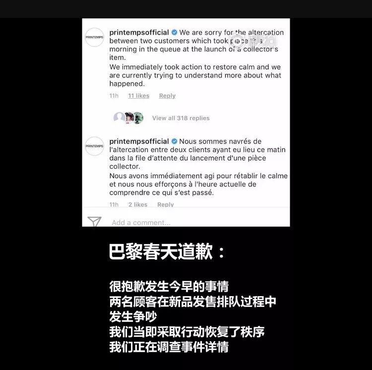 據瞭解,這次事件的根本原因是 PRINTEMPS 巴黎春天百貨的店員及保安對這次「打架事件」的處理不當,事後巴黎春天百貨也並沒有針對這次事件發表官方聲明,僅在評論區發表了非正式道歉,涉及的購買品牌 BALENCIAGA 也沒有就此事發表態度。
